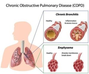 Chronic Obstruction Pulmonary Disease (COPD) is a long-term lung condition characterised by breathlessness, coughing, and increased mucus. This leads to blocked airways (bronchioles) and damaged air sacs (alveoli). Lets break COPD down… Chronic = long term (does not go away) COPD is an umbrella term which includes: COPD is progressive and irreversible. However, with good management and support, people can live long and healthy lives. The main causes of COPD are smoking, exposure to air pollution, or genetic factors like alpha-1-antitrypsin deficiency (emphysema) Chronic Bronchitis – The presence of sputum production and long-term productive cough for three months during two consecutive years when other lung or heart causes for these symptoms have been excluded. Emphysema – Abnormal, permanent enlargement of the air spaces (alveoli) at the bases of the lungs, accompanied by destruction of their walls Imagine your air sacs are a bunch of grapes. Instead of having several separate grapes, you instead have one large grape.
